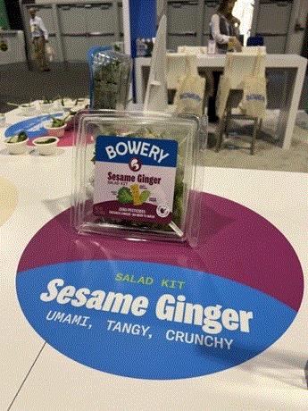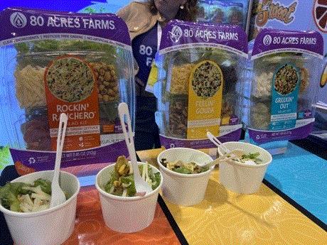 Mastronardi Produce was highlighting its Queen of Greens leafy greens in a salad kit, 80 Acres Farms (pictured below) had their own fresh take, Gotham Greens (which had a head start with their own salad dressings) were previewing kits that they said were gaining lots of interest, and the list goes on and on.