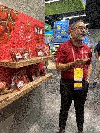 Mucci Farms showcased its new Savorries line of tomatoes that had a strawberry shape, high Brix, and best of all, is Rugose resistant. Communications Manager Ajit Saxena (pictured) told us they see vine-ripened and snacking tomatoes on the rise, so this hits all the right sweet spots, as it’s big enough to still cook with, but small enough to still snack on.