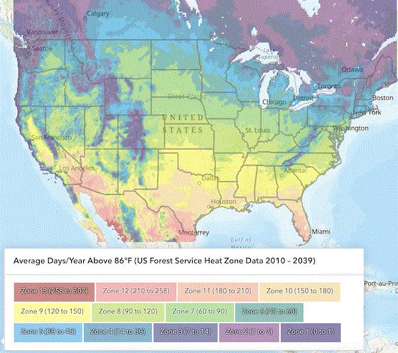 They’ve set it up so that you get a broad overview of the Heat Zones by looking at the legend. For more precise information, you can also zoom in to an area and click on your location to activate a pop-up that shows the number of days above 86F there.