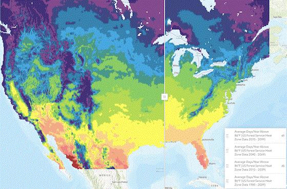 This comparison app provides predictive visual comparisons of the likely northward progression of heat zones over time. Simply select which 30-year period you’d like to view then drag the slider bar to see how the heat zones are projected to change.