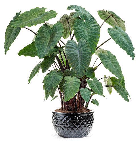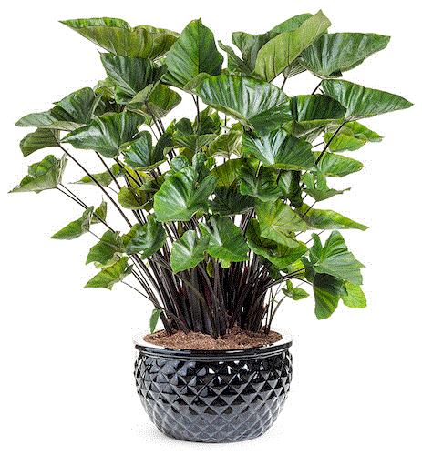 The second is Heart of the Jungle colocasia. It’s similar in habit to Coffee Cups but with non-cupped, heart-shaped dark green leaves and black stems.