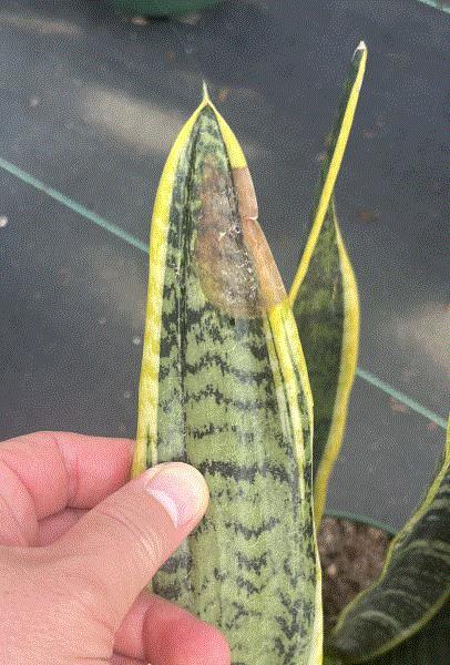 I saw something interesting at one such expanding operation. There were several cultivars of sansevieria, or snake plant, grown from unrooted liners sourced from a South American country. Many of them had large water-soak lesions on the leaves. What’s causing these lesions?
