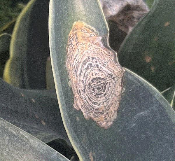 The water-soaked lesion I showed y’all earlier is an early symptom of Anthracnose, caused by the fungal pathogen Colletotrichum sansevieriae. Below is another picture of a concentric ring, which is a more advanced symptom of the disease and an easier symptom to diagnose this disease, at least to a non-pathologist like me.
