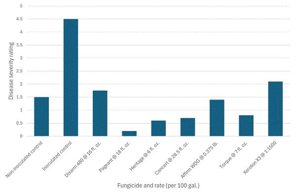 Vanessa and Aaron also conducted trials to identify fungicides that are effective in managing this disease, both preventively and curatively. They identified preventive sprays of Pageant Intrinsic at 18 fl. oz. per 100 gal. (boscalid + pyraclostrobin; FRAC 7 + 11), Heritage at 6 fl. oz. per 100 gal. (azoxystrobin; 11), Concert at 28.5 fl. oz. per 100 gal. (propiconazole + chlorothalonil; 3 + M5), and Torque at 7 fl. oz. per 100 gal. (tebuconazole; 3) as the most effective options in reducing disease severity when compared to the inoculated control (see the graph below).